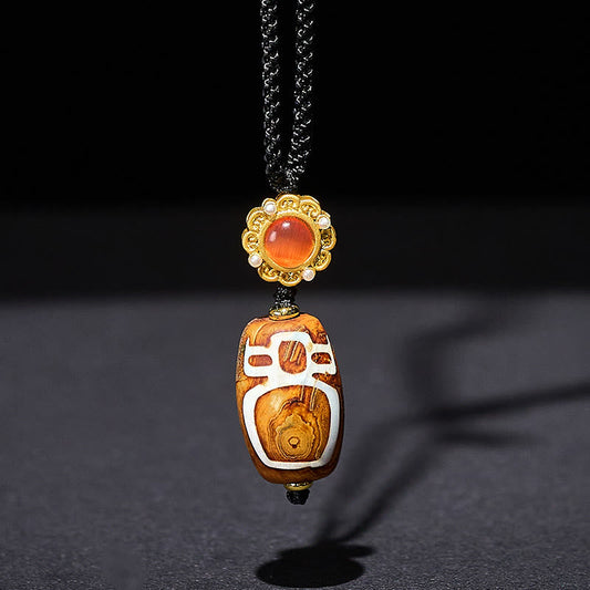 Buddha Stones Tibetan Agate Carved God of Wealth Nine-eye Dzi Bead Blessing Necklace Pendant