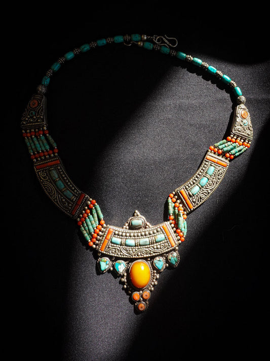 Tibetan Amber, Turquoise & Coral Necklace with White Copper
