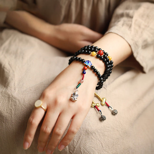 Buddha Stones Chinese Zodiac Obsidian PiXiu Protection Mala Bracelet