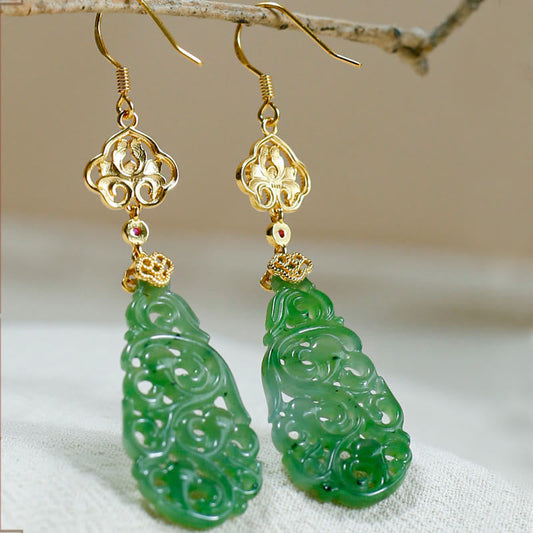 Buddha Stones Hetian Jade Flower Pattern 14K Gold Plated Luck Drop Dangle Earrings
