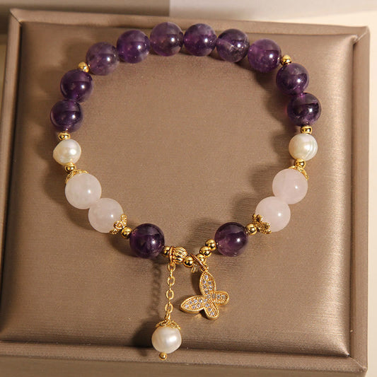 Buddha Stones Natural Amethyst Pearl Crystal Spiritual Healing Butterfly Charm Bracelet