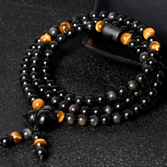 Buddha Stones Natural Black Obsidian Rainbow Obsidian Gourd Blessing Bracelet Mala