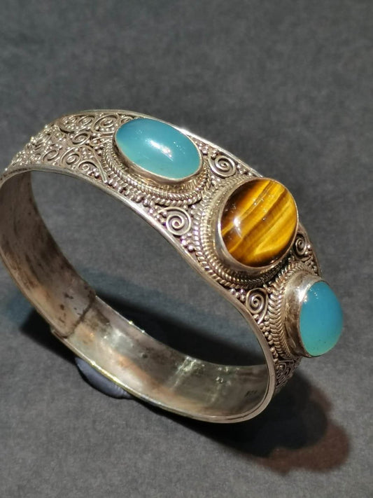 Tranquil Strength Bracelet | Pure Silver Bangle with Aquamarine and Tiger Eye for Calm and Protection