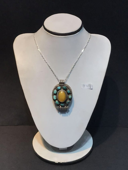 Tibetan Amber, Turquoise & Coral Necklace with White Copper
