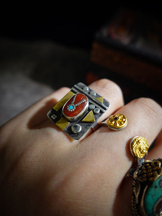 Turquoise & Red Coral Patchwork Ring | Gold-Plated Sterling Silver Tibetan-Inspired Ring