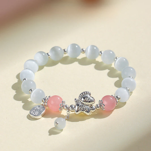Buddha Stones Natural Cat's Eye Rose Quartz Crystal Year of the Horse Fu Character Love Bracelet