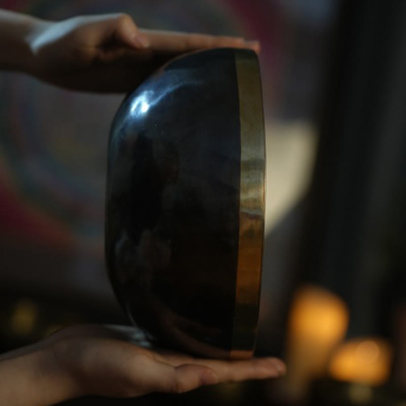 - Knock the bowl with our wooden striker on the bowl's rim or body