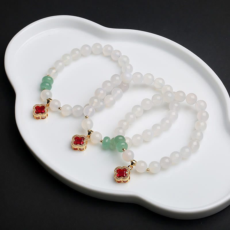 Buddha Stones Natural White Agate Red Agate Money Bag Fu Character Four Leaf Clover Protection Bracelet