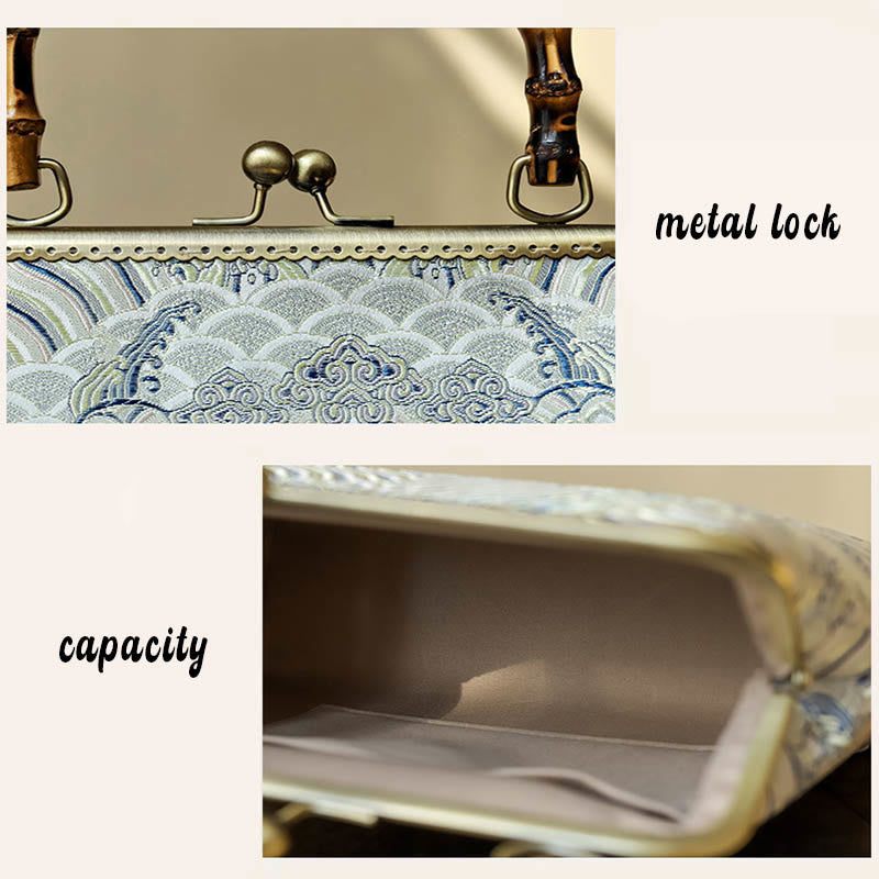 Buddha Stones Silver Lines Bamboo Handle Metal Chain Crossbody Bag Handbags