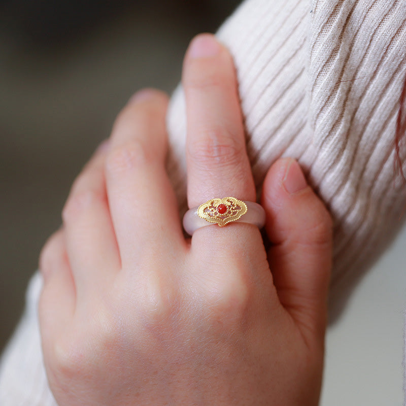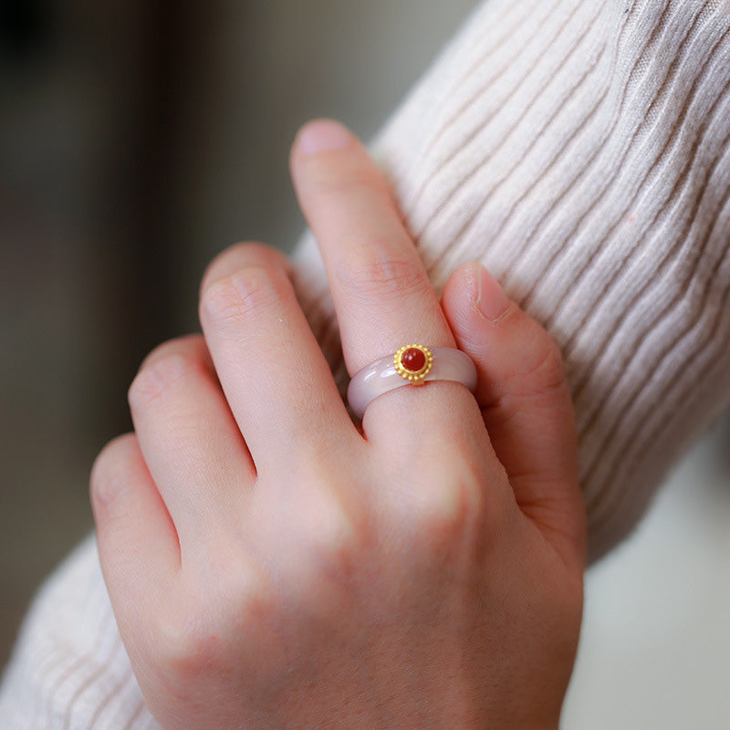 Buddha Stones White Agate Cyan Jade Turquoise Red Agate Luck Protection Ring